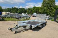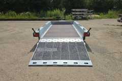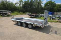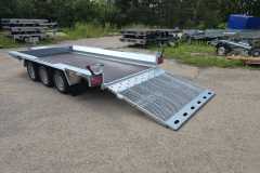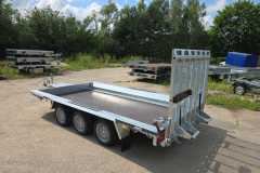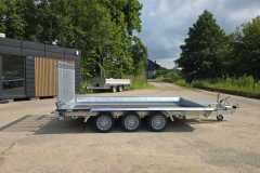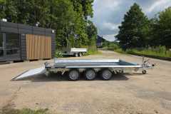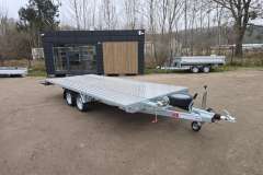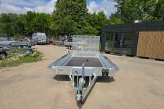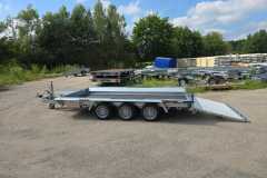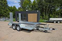 Solidna spawana przyczepa do przewozu maszyn budowlanych oraz bardzo ciężkich materiałów. Oryginalna konstrukcja daje możliwość chodzenia po całej długości burt wyposażonych w taśmy antypoślizgowe. Rama nośna spawana wykonana ze stalowych profili zamkniętych. Podłoga wykonana ze sklejki wodoodpornej antypoślizgowej zaopatrzona w solildne uchwyty podłogowe do mocowania ładunku zapewniające bezpieczeństwo przewożonych towarów. Bardzo wytrzymały dyszel typu V i podpory stabilizujące najazd. Podpora łyżki oraz koło podporowe z automatem składania w standardzie. Sprężyny ułatwiające opuszczanie i podnoszenie najazdu. Możliwość zastąpienia szerokiej rampy najazdowej dwoma najazdami redukując tym samym masę przyczepy, a co za tym idzie zwiększając jej ładowność.
